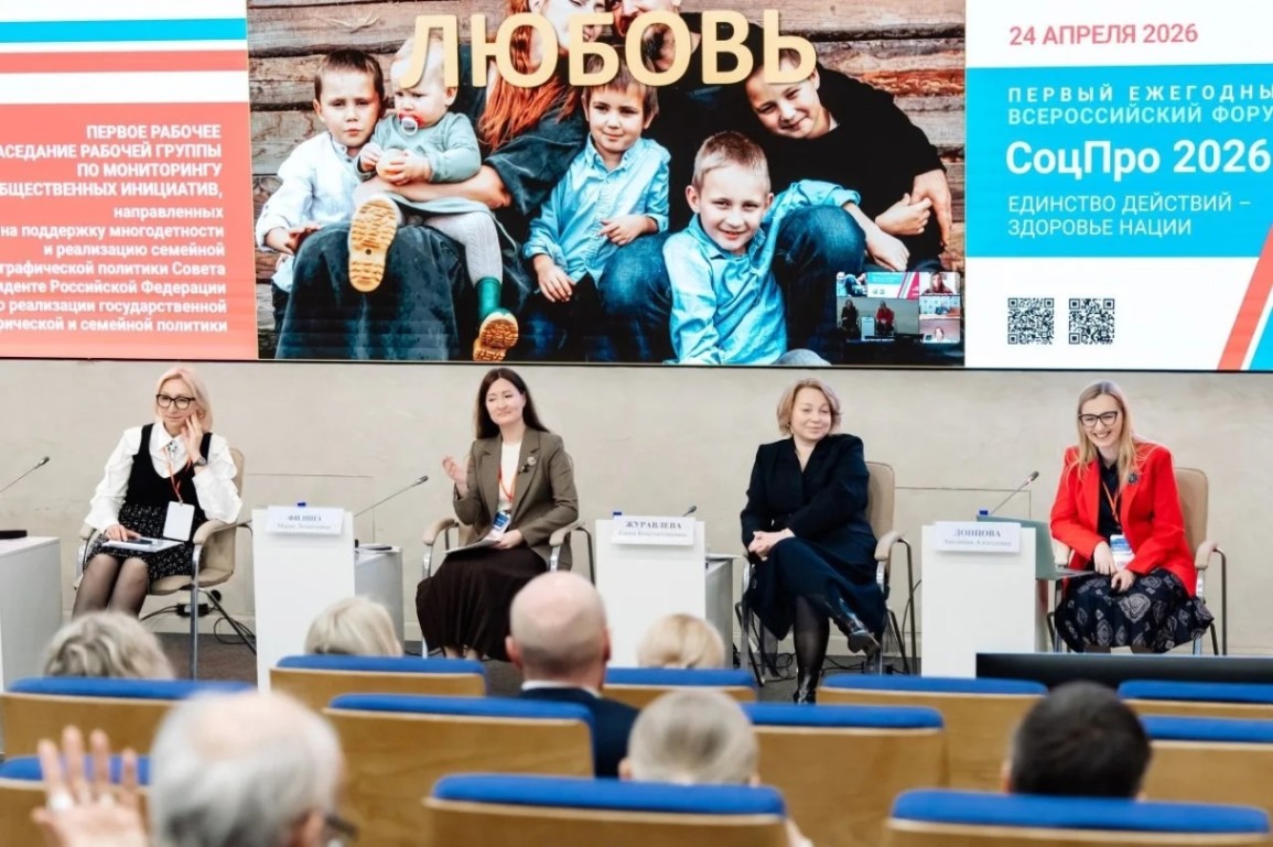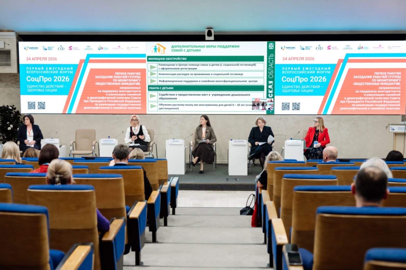В рамках Всероссийского форума «СоцПро-2026. Единство действий – здоровье нации» 24 апреля в Общественной палате РФ прошло первое заседание Рабочей группы по мониторингу общественных инициатив, направленных на поддержку многодетности и реализацию семейной и демографической политики, при Президентском совете по демографии. В форуме приняли участие порядка 420 человек из более чем 45 регионов России.
