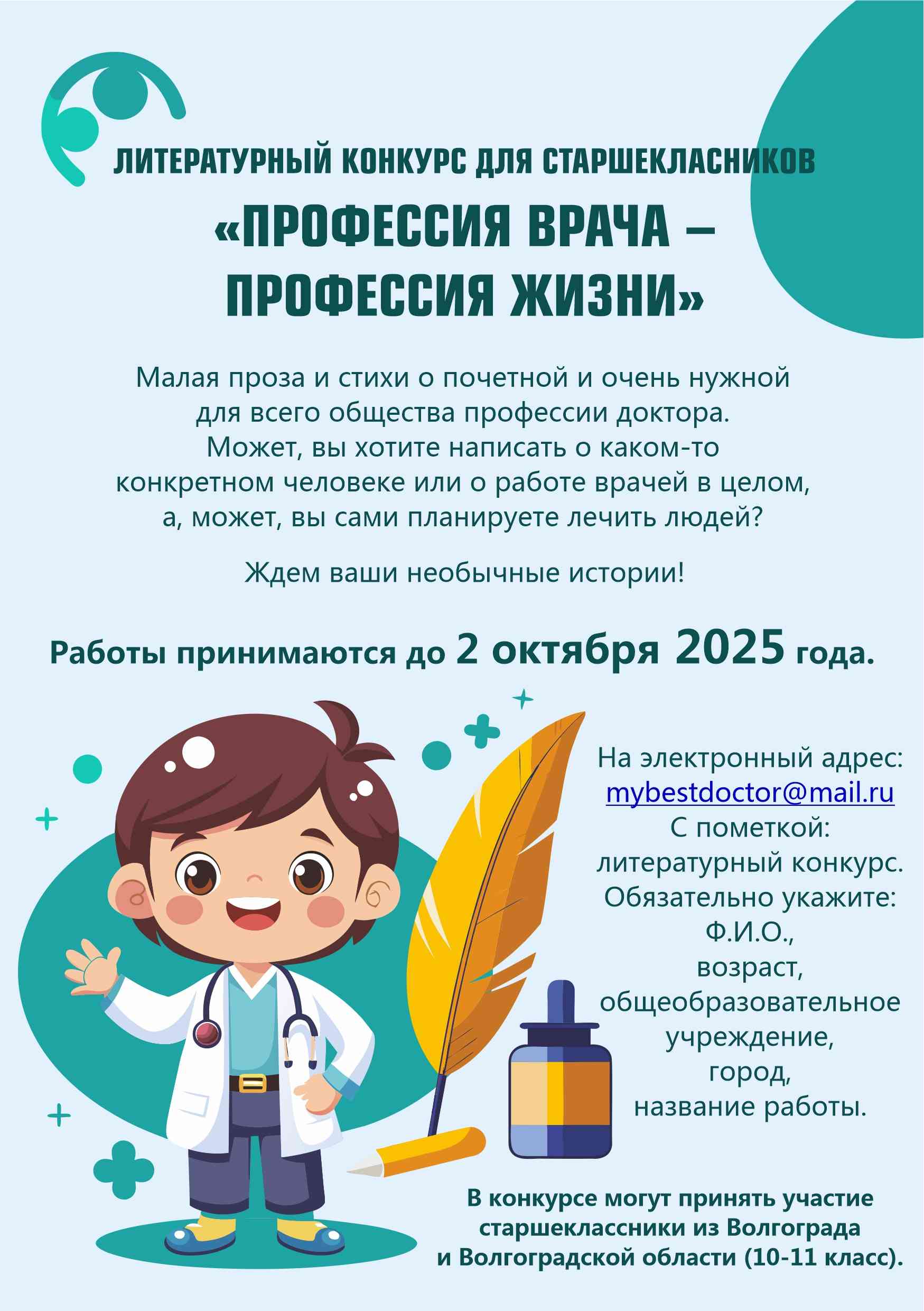 Работы принимаются до 2 октября 2025 г. на электронный адрес: mybestdoctor@mail.ru с пометкой: ФИО, возраст, общеобразовательное учреждение, город, название работы.