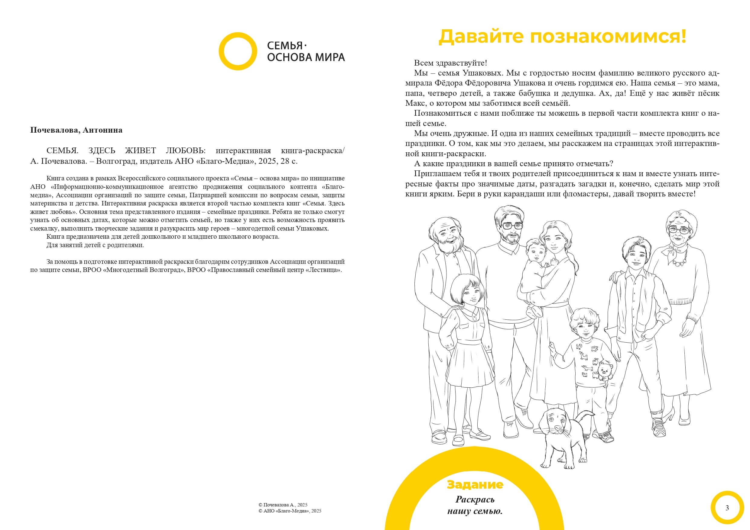 Для самых маленьких: детей дошкольного и школьного возраста, мы приготовили комплект книг из жизни современной многодетной семьи Ушаковых, к которым в гости приходят дедушка Коля и бабушка Лёля. О том, что такое любовь, доброта, семейные традиции, история семьи и страны, ответственность, честность и другие важные для человека качества, читайте вместе с детьми в книге рассказов «Семья. Здесь живет любовь». Выполняйте задания, отгадывайте загадки, связанные с семейными ценностями, во второй части комплекта – интерактивной книге-раскраске.